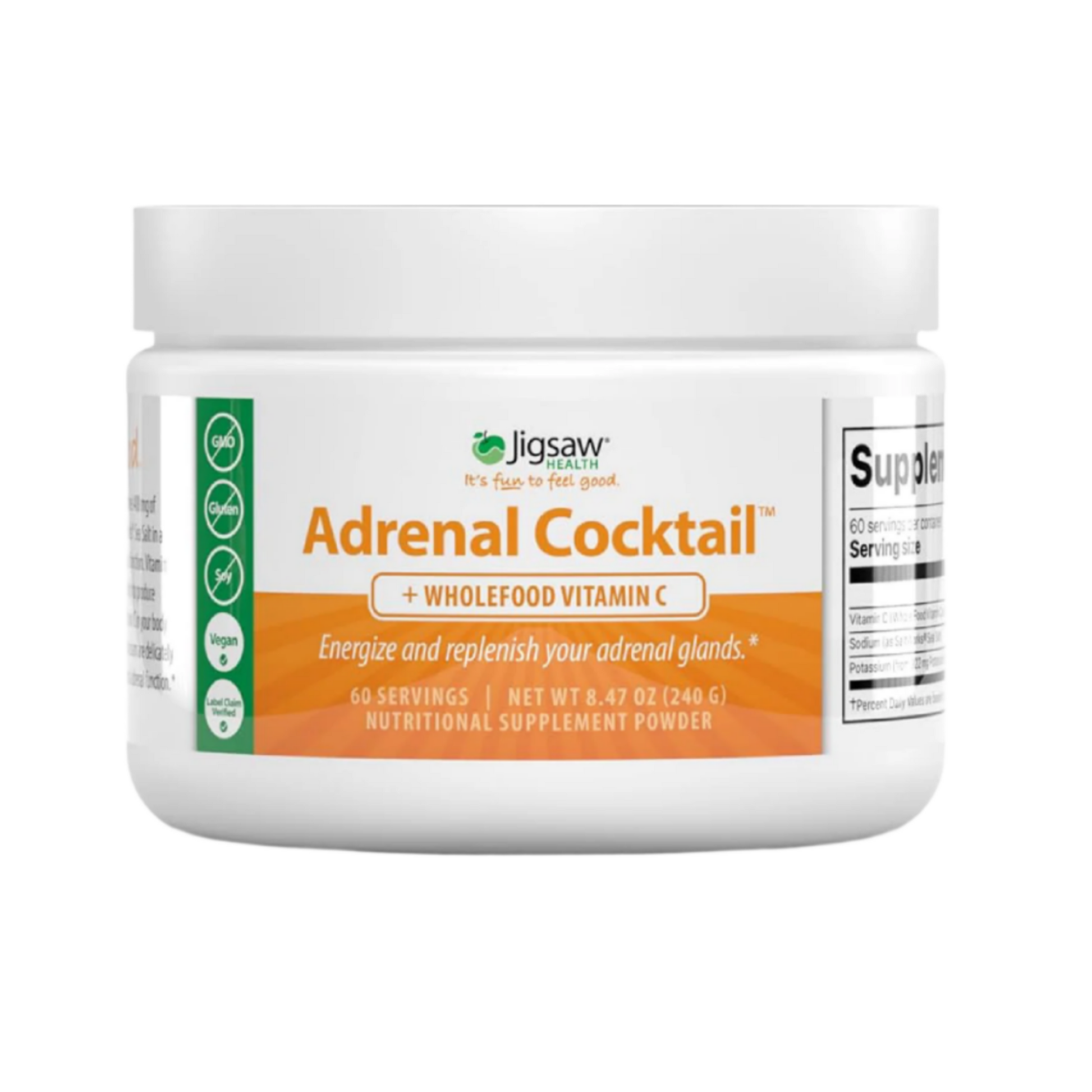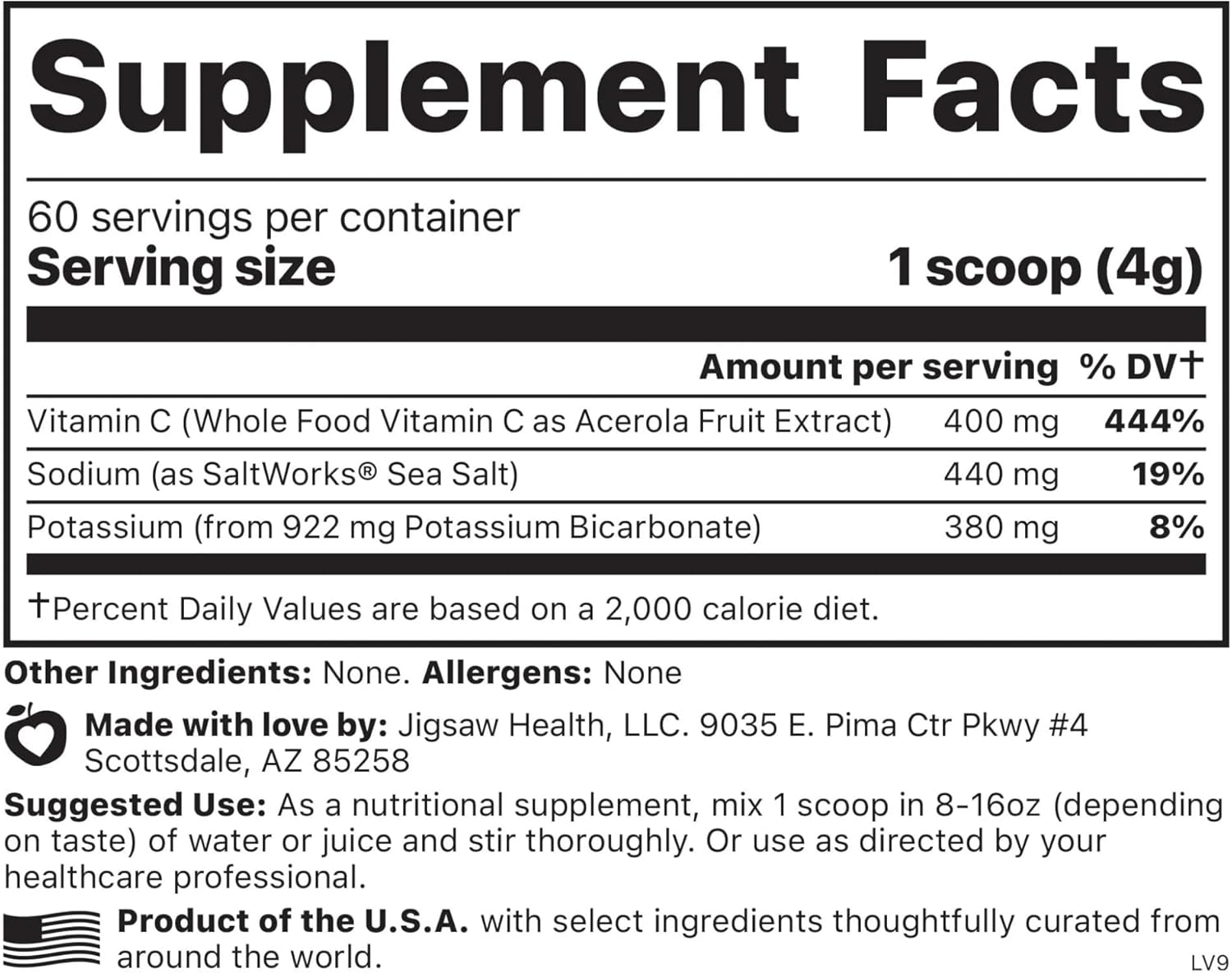 Jigsaw Adrenal Cocktail™ + Wholefood Vitamin C is a unique combination of 3 simple, yet powerful ingredients -- Potassium Bicarbonate, SaltWorks® Sea Salt, and Acerola Cherry Extra.  Promotes adrenal health to support a balanced response to stress, support energy production, reduce leg cramps, and reduce bloating.*
