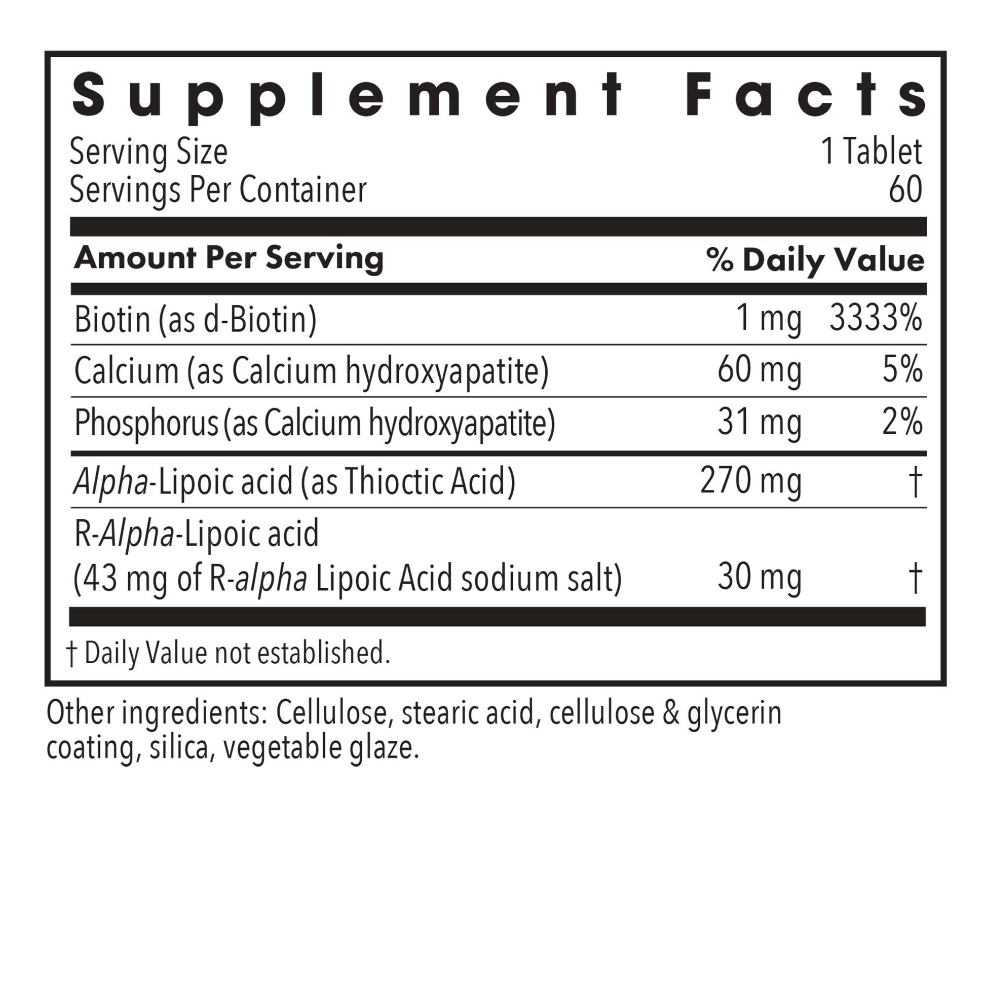 An alpha-lipoic acid complex, containing alpha-lipoic acid, R-alpha-lipoic acid, biotin, and calcium.