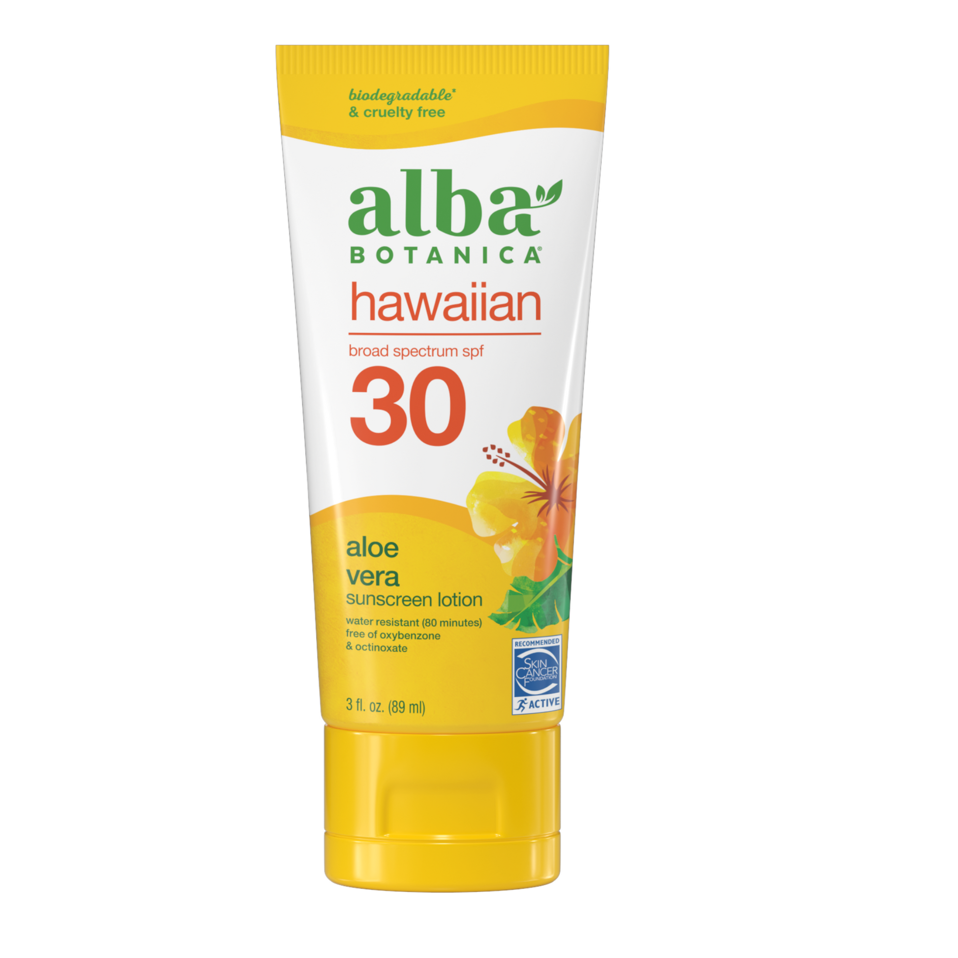 Moisturize and protect your skin with Alba Botanica Sunscreen. Made with nourishing botanical extracts, this lightweight sunscreen provides broad spectrum protection against sunburn, skin cancer and premature signs of aging. Our sunscreen is water resistant for up to 80 minutes and is recommended by the Skin Cancer Foundation. Our formula is 100% vegetarian and has no oxybenzone, octinoxate or synthetic fragrances.