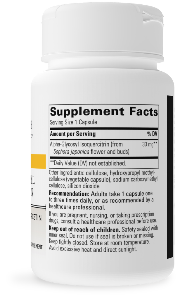Quercetin is an important flavonoid that provides free radical protection, promotes DNA integrity, and supports cellular regulation. It has been studied for its support of antioxidant pathways and healthy glutathione levels. Alpha-Glycosyl Isoquercitrin delivers all the benefits of quercetin with better absorption and improved bioavailability.*