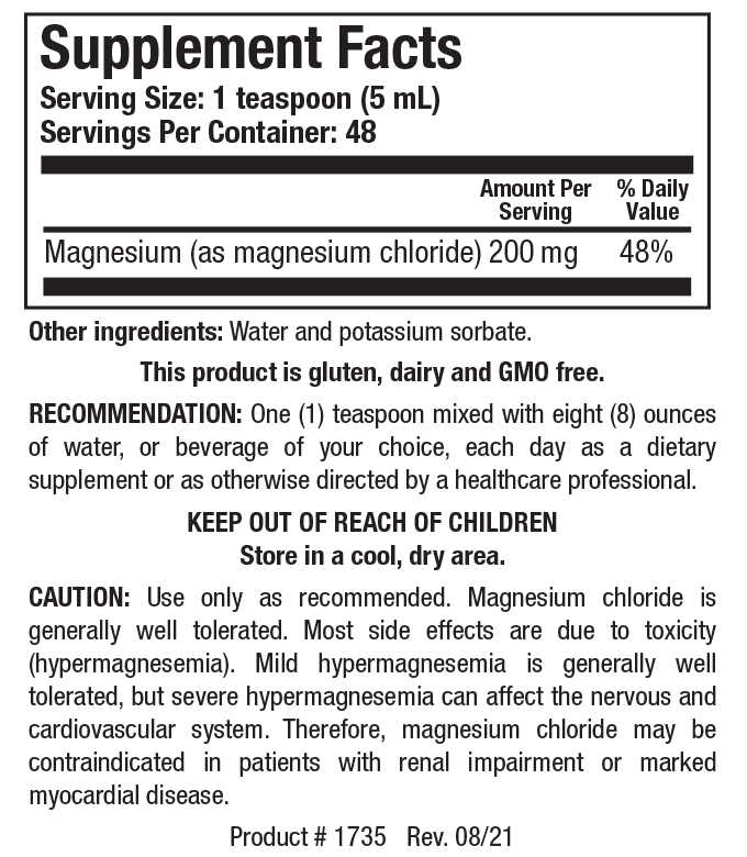 Aqua Mag-Cl™ is a liquid magnesium chloride supplement, supplying 200 mg of magnesium per teaspoon.