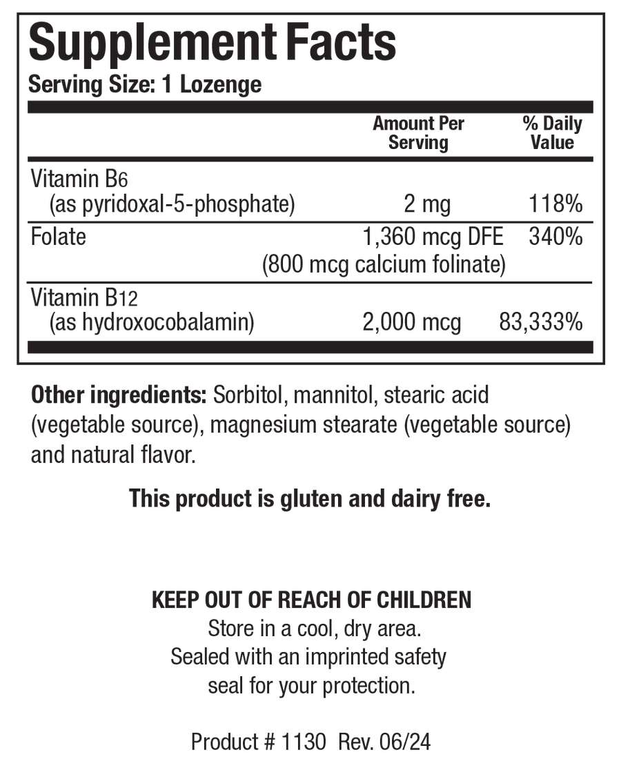 Each B12-2000™ pleasant tasting lozenge supplies a high potency level of vitamins B12, folate, and B6. B12-2000™ Lozenges are especially important for women who are pregnant, or who are wishing to become pregnant, as they contain highly beneficial levels of folate.