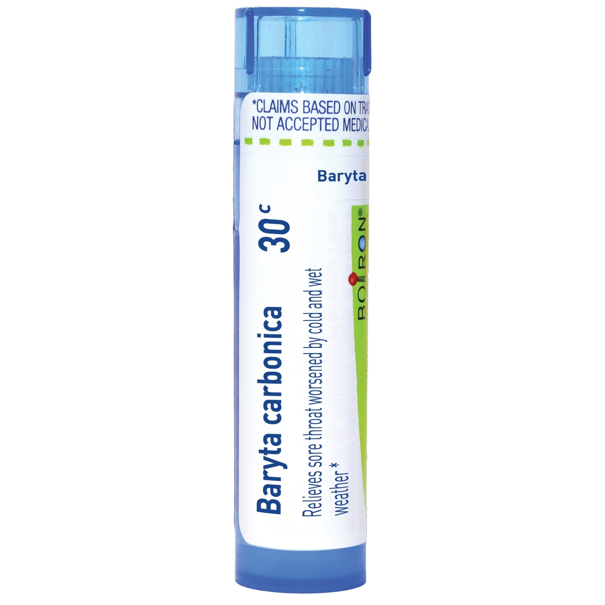 Baryta Carbonica is a homeopathic medicine that relieves sore throat worsened by cold and wet weather.* The pellets melt in your mouth and can be taken on the go, no food or water needed.