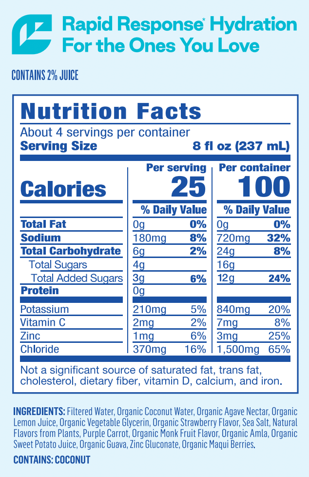 The only plant-based, USDA certified organic oral electrolyte solution and natural alternative to Pedialyte. From stomach flu and food poisoning to heat exhaustion and travel sickness, Berri Lyte is the easy way to give kids an electrolyte boost for rapid rehydration. With no synthetic electrolytes, this electrolyte solution is delivering delicious nutrition with organic coconut water, organic sweet potato juice, organic maqui superberries, and organic guava.