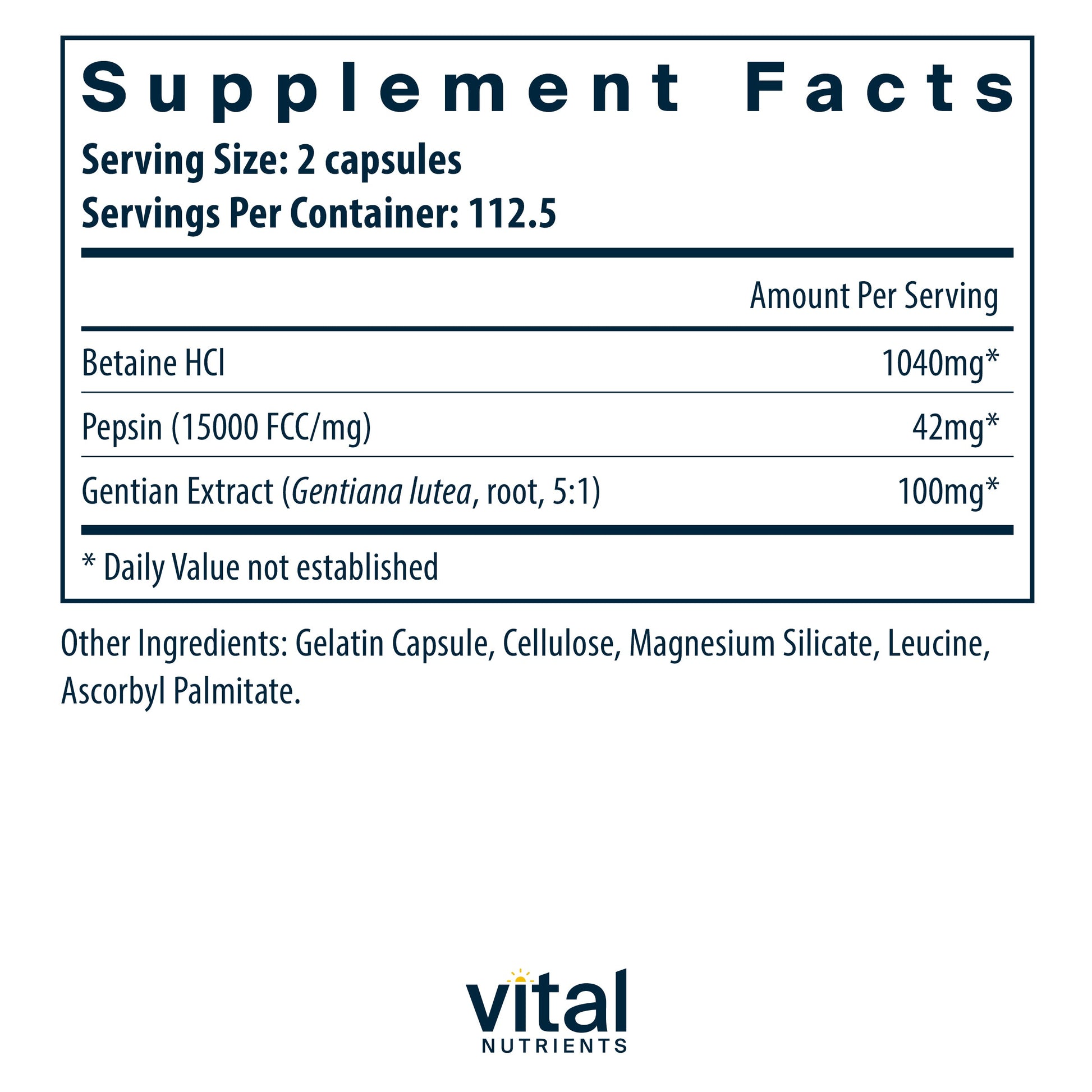 This combination of betaine HCl, pepsin, and gentian root extract provides comprehensive digestive support for healthy protein digestion and nutrient absorption.*