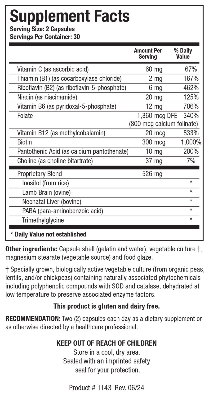 Bio-GGG-B™ is a multi B-vitamin complex, supplying vitamins B1, B2, niacin, B6, B12, folate, biotin and pantothenic acid, with emphasis on riboflavin (vitamin B2), also referred to as vitamin G. It is fortified with additional synergists, including vitamin C, inositol, PABA (para-aminobenzoic acid), & choline, and also includes trimethylglycine, as well as organ/glandular specific support (neonatal bovine liver and lamb brain).