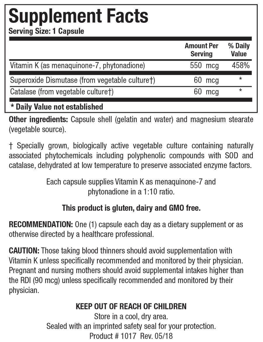 Bio-K Forte Caps® contains a combination of vitamins K1 and K2, each of which targets different tissues in the body. The K1 family of compounds (phylloquinones), synthesized in green leafy vegetables and in plant leaves, is the primary dietary source of vitamin K, estimated to contribute about 40-50% of the total dietary intake. Unlike phylloquinones, menaquinones (K2) are present in both human and animal tissues, and are largely synthesized by the gut microflora. Vitamin K2 is associated with beneficial cardiovascular attributes.*