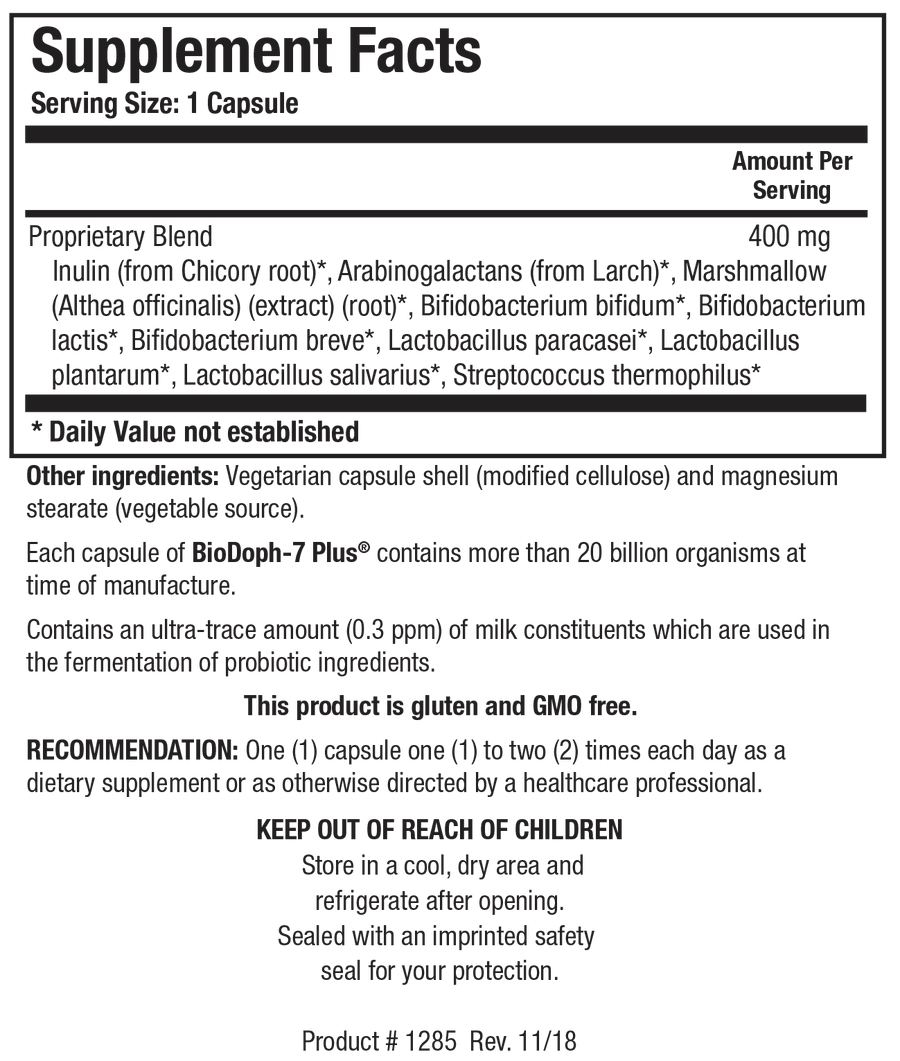 BioDoph-7 Plus® supplies a specific blend of 3 prebiotics and 7 probiotics extensively tested to ensure optimal colonization with bacterial strains recognized for their bioactivity. It contains 20 billion viable organisms per capsule, providing optimal probiotic coverage.
