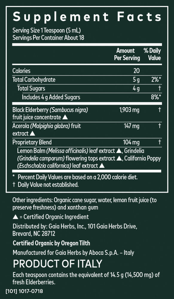Made with organic Elderberries, fresh-pressed shortly after harvest, this Certified USDA Organic syrup concentrates the juice from 14.5 grams of Elderberries into a single, tasty teaspoon to support immune health and a good night's rest.*