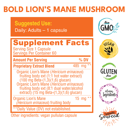 Formulated with two concentrated organic extracts made from the fruiting body –utilizing both hot water and ethanol to capture the broadest range of beneficial active compounds. Each capsule contains 115 mg bio-active beta-glucans which is verified via 3rd party testing. Supports brain health, memory, mood, nerve, and immune system.