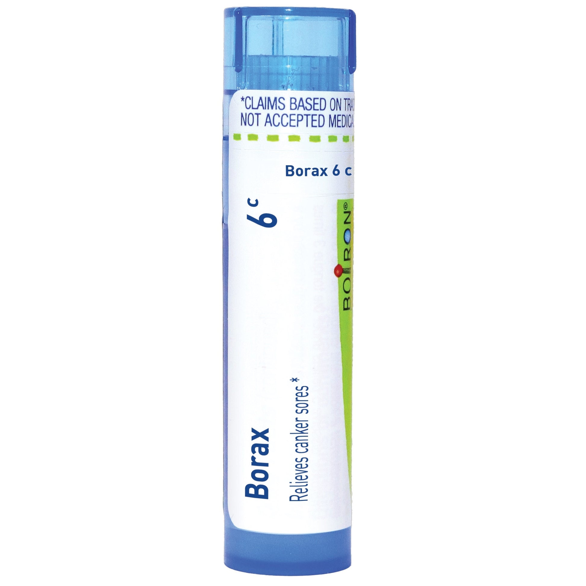 Borax is a homeopathic medicine that relieves canker sores.* The pellets melt in your mouth and can be taken on the go, no food or water needed.
