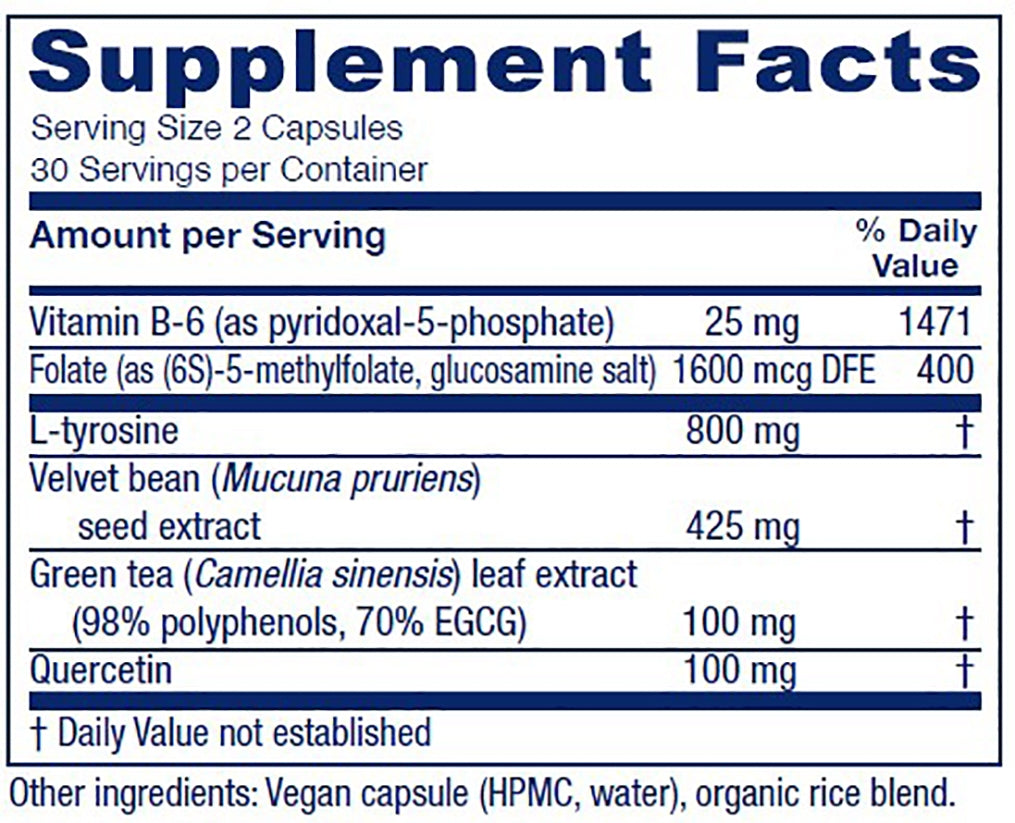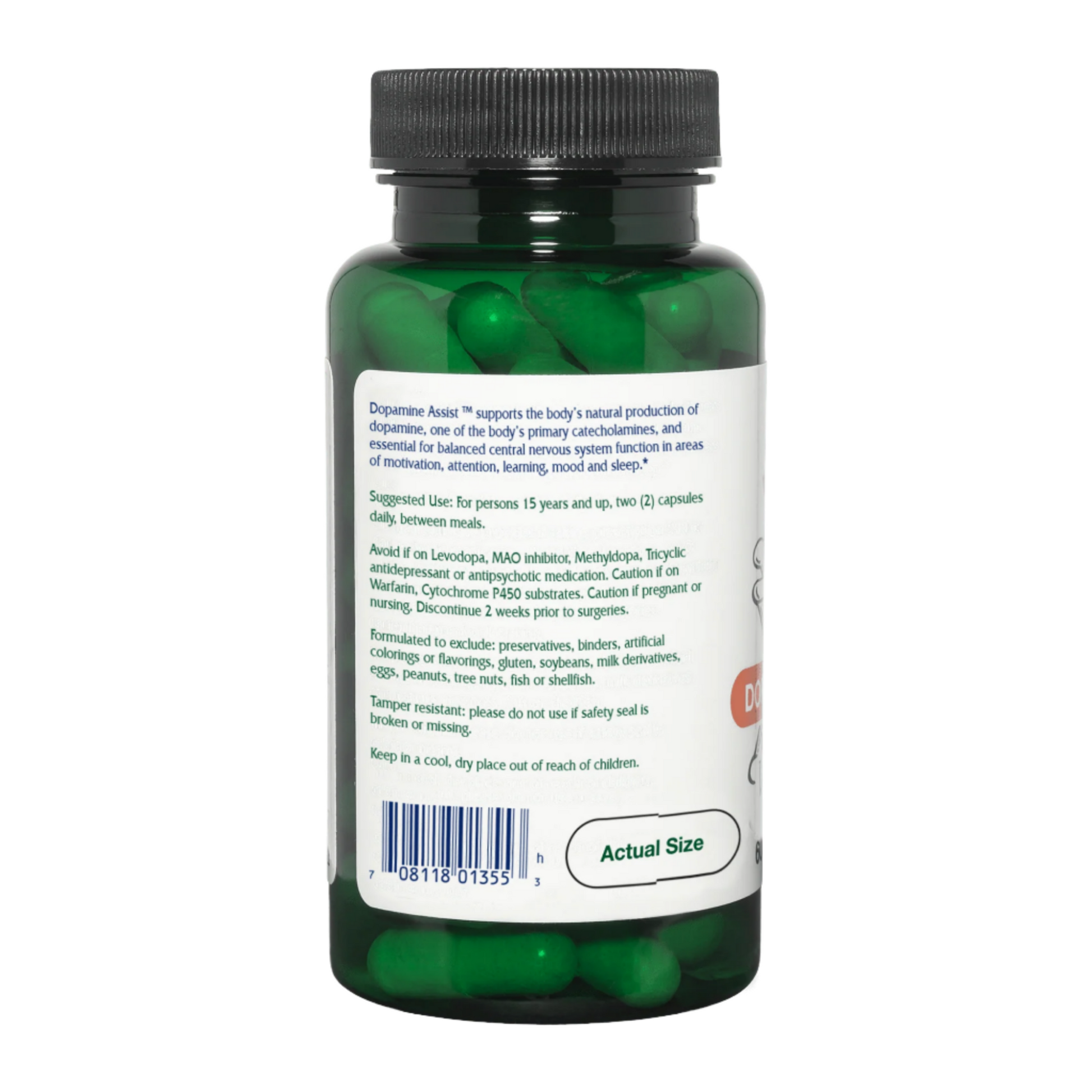 Dopamine Assist supports the body’s natural production of dopamine, one of the body’s primary catecholamines, and essential for balanced central nervous system function in the areas of motivation, attention, learning, mood and sleep.*