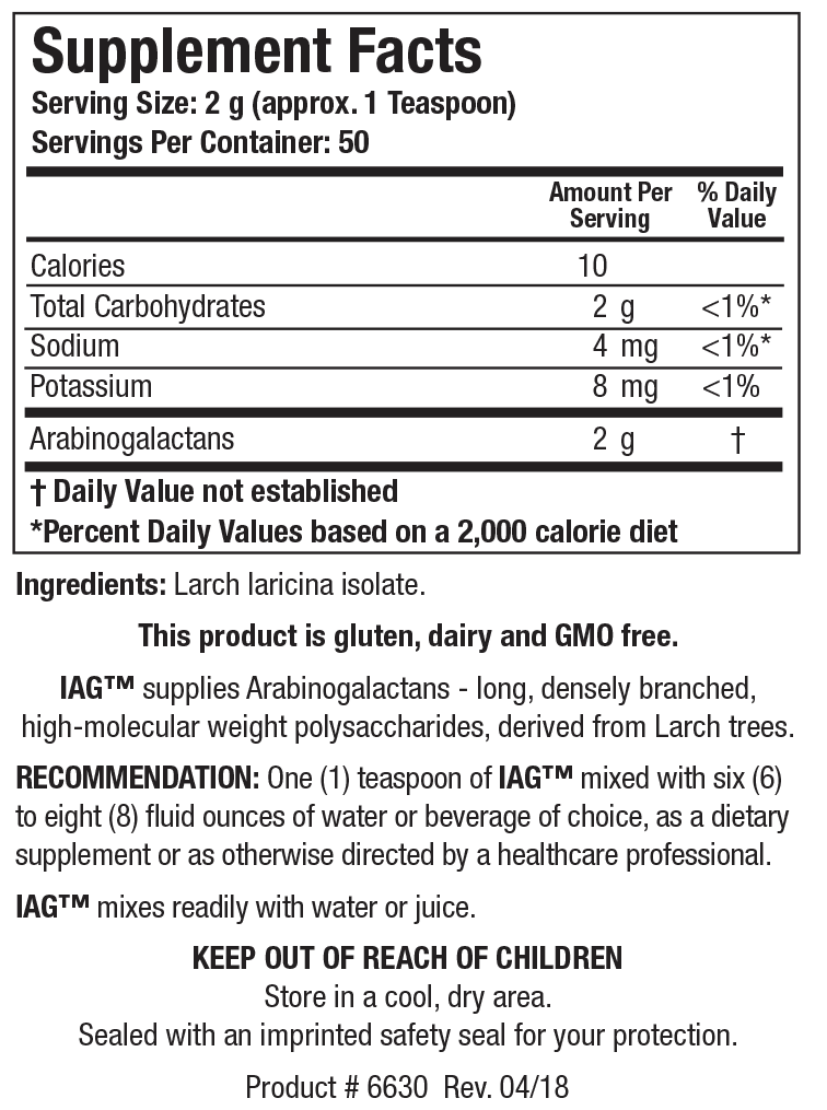 IAG™ supplies arabinogalactans, derived from the Larch tree. Arabinogalactans are long, densely branched, high-molecular weight polysaccharides. They act as a natural activators of the immune system's complement pathway, enhancing natural killer cell activity. In addition to immune support, IAG also functions as a prebiotic, and is utilized by commensal bacteria to further enhance gut health.