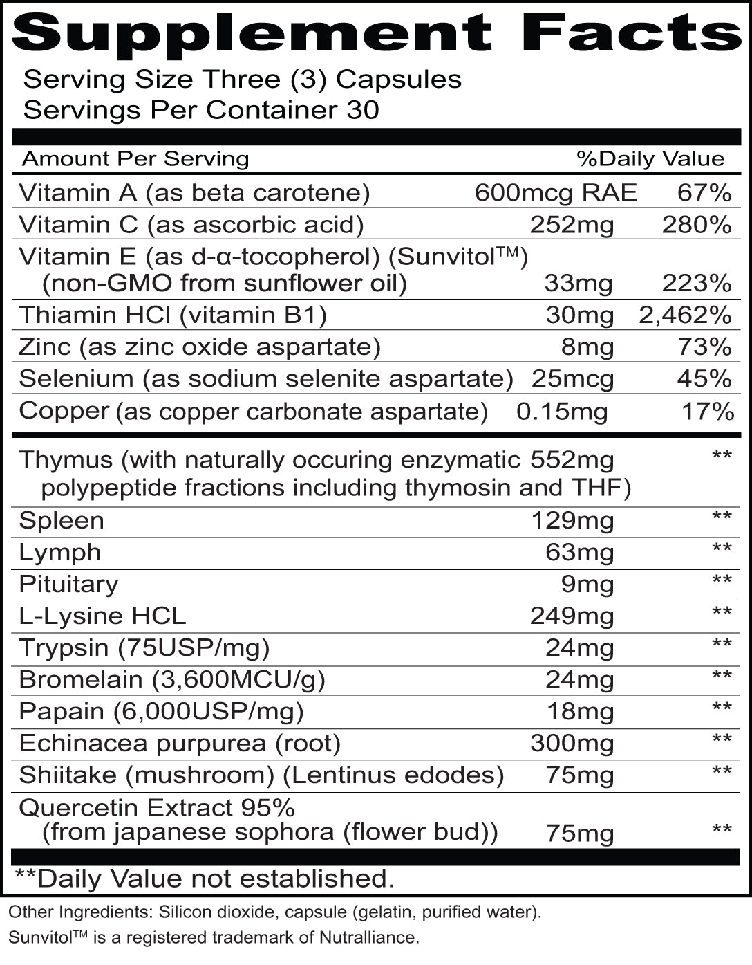 Thymic function is essential to immune health, yet thymic activity in the body is known to decline with age. Immuno Caps supplies therapeutic levels of whole gland thymus along with an array of immune supportive nutrients.*