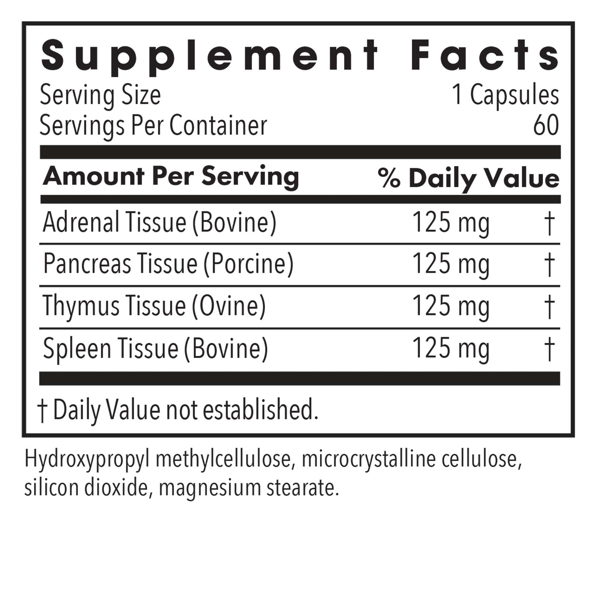 A mixture of glandulars, including adrenal, pancreas, thymus and spleen tissue. Our natural glandular material is derived from government-inspected, range-fed animals, raised in New Zealand and Australia, whose animal husbandry regulations are among the strictest in the world. The material is lyophilized, which means it is immediately frozen, then subjected to a high vacuum that vaporizes moisture directly from the solid state.