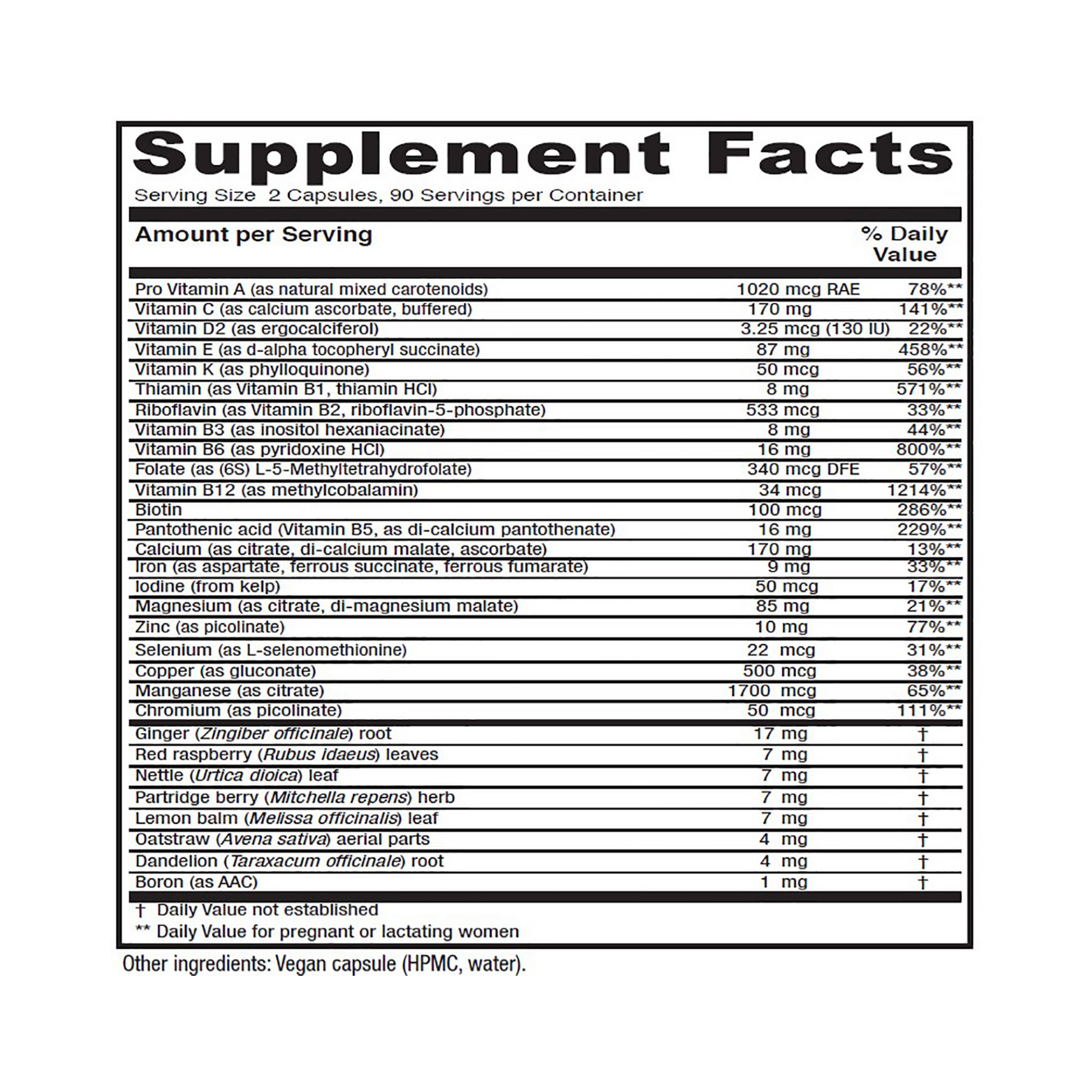 A unique and high-quality blend of vitamins, minerals, and herbs supportive for women anticipating pregnancy, during pregnancy, for several months following childbirth and during breastfeeding.