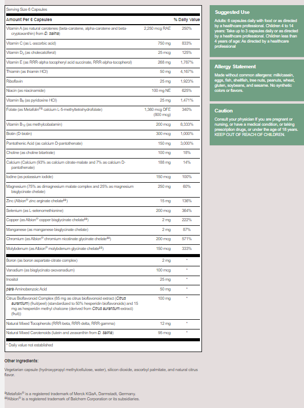 This comprehensive multiple vitamin/ mineral/trace element supplement is for a sound nutritional foundation. A good choice for women who do not need extra iron. MultiThera® 1 Capsule Formula contains an important balance of fat-and water-soluble antioxidants, B-complex vitamins, and other nutrients of a sound nutritional foundation. With activated forms of folate (Metafolin®‡ L-5-methyltetrahydrofolate) and vitamin B12 (methylcobalamin) for enhanced absorption and bioactivity.† MultiThera® 1 contains a full spectrum of bioavailable trace elements, excluding iron and vitamin K, making it suitable for those using anticoagulant medications who wish to avoid taking this nutrient. MultiThera® 1 Capsule Formula is well suited for those who prefer capsules or have difficulty swallowing, as the capsules may be pulled apart and the contents mixed with food if desired.