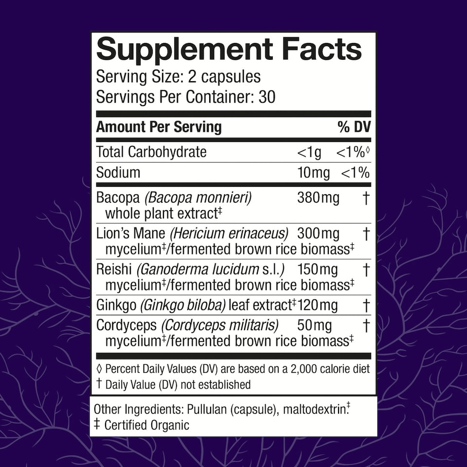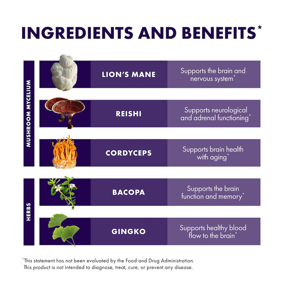 MycoBotanicals® Brain* is a blend of mushroom mycelium and herbs specifically designed to support concentration, memory, cognitive functioning, and the nervous system.*