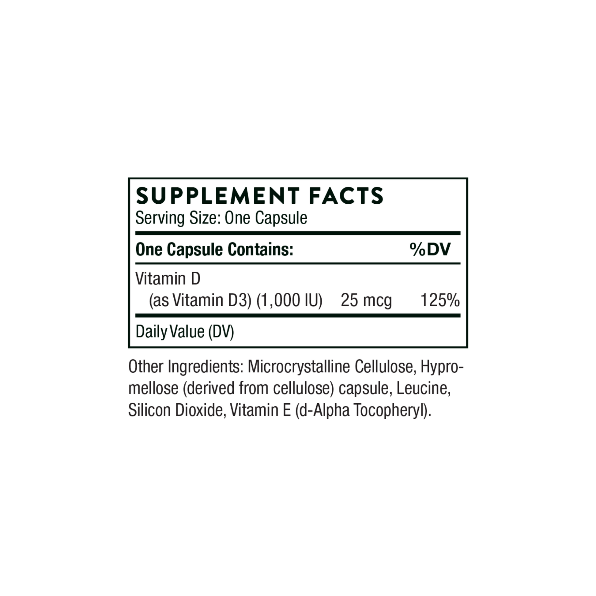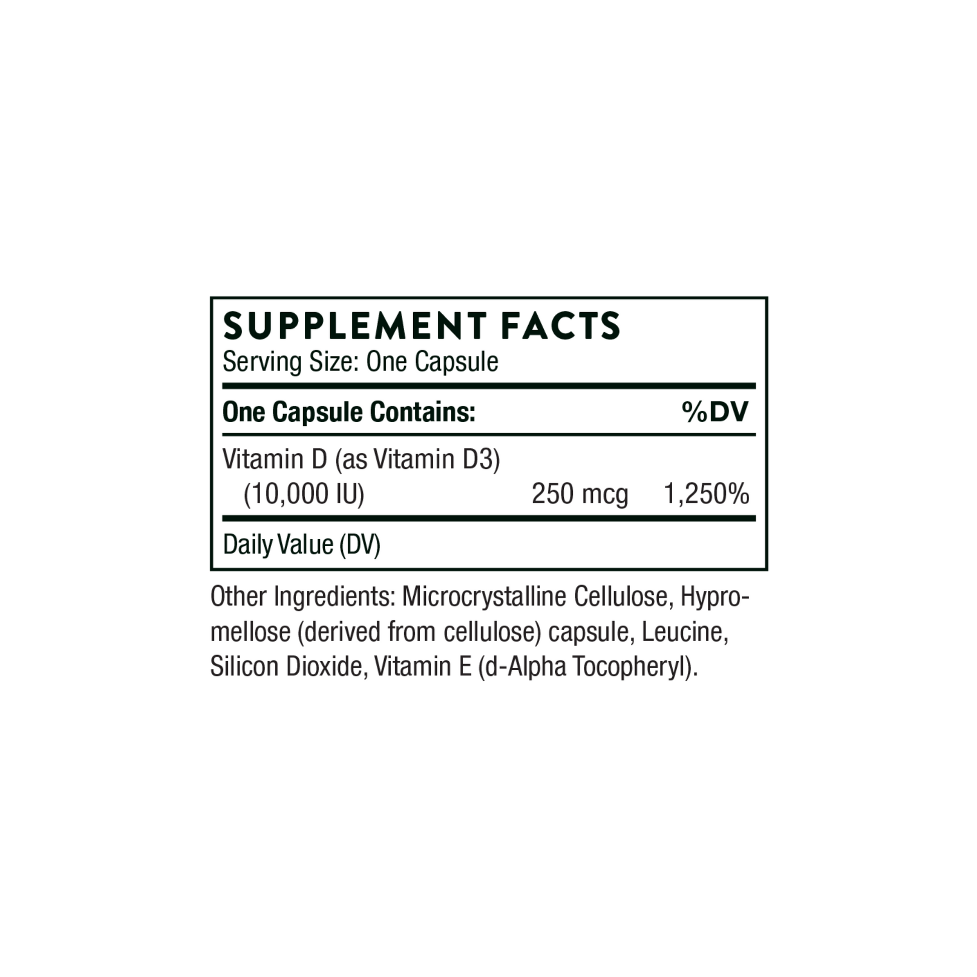 Vitamin D, in its D3 form, is more potent and better absorbed form than its D2 form. Thorne’s vitamin D supplements contain no lactose and no preservatives.